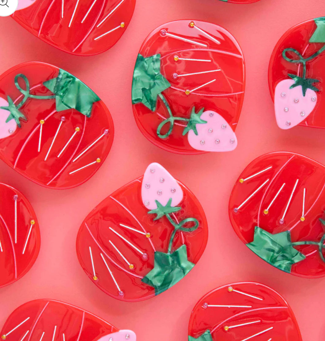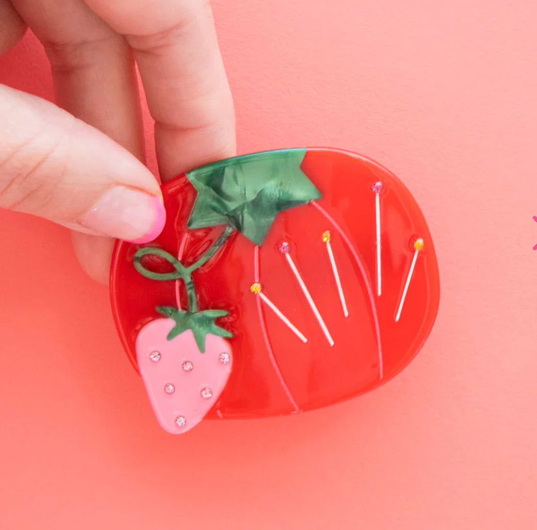 Show off your passion for sewing with the Tomato Pincushion French Barrette! This charming clip sports a curved, round tomato design with a vibrant red base, pearly green leaves, a cute pink strawberry, embossed accents, and glimmering rhinestones. Like all our hair accessories, it's made from plant-based cellulose acetate, meaning it's biodegradable and better for the environment.